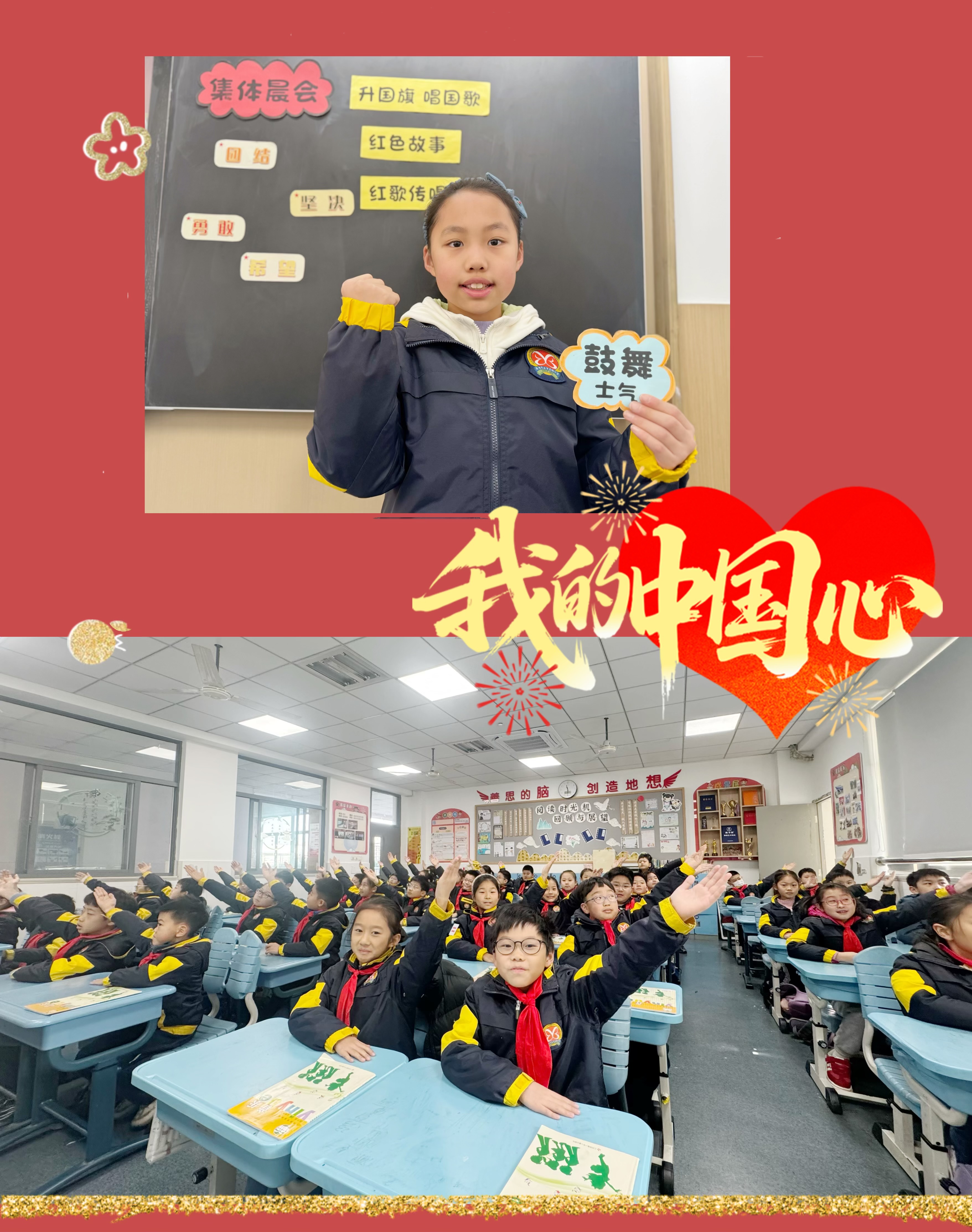 “红星闪闪放光彩,红星灿灿暖胸怀。”听,红歌的旋律激昂回荡。同学们昂首挺胸,精神饱满,用嘹亮的歌声传递着爱国情怀,童心向党唱红歌,红色精神在歌声中代代相传。
